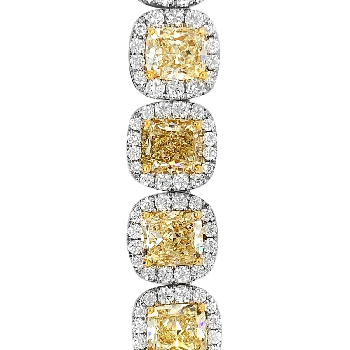 Style: Halo Micro-Pave Setting on each Cushion cut Fancy Yellow Diamond.