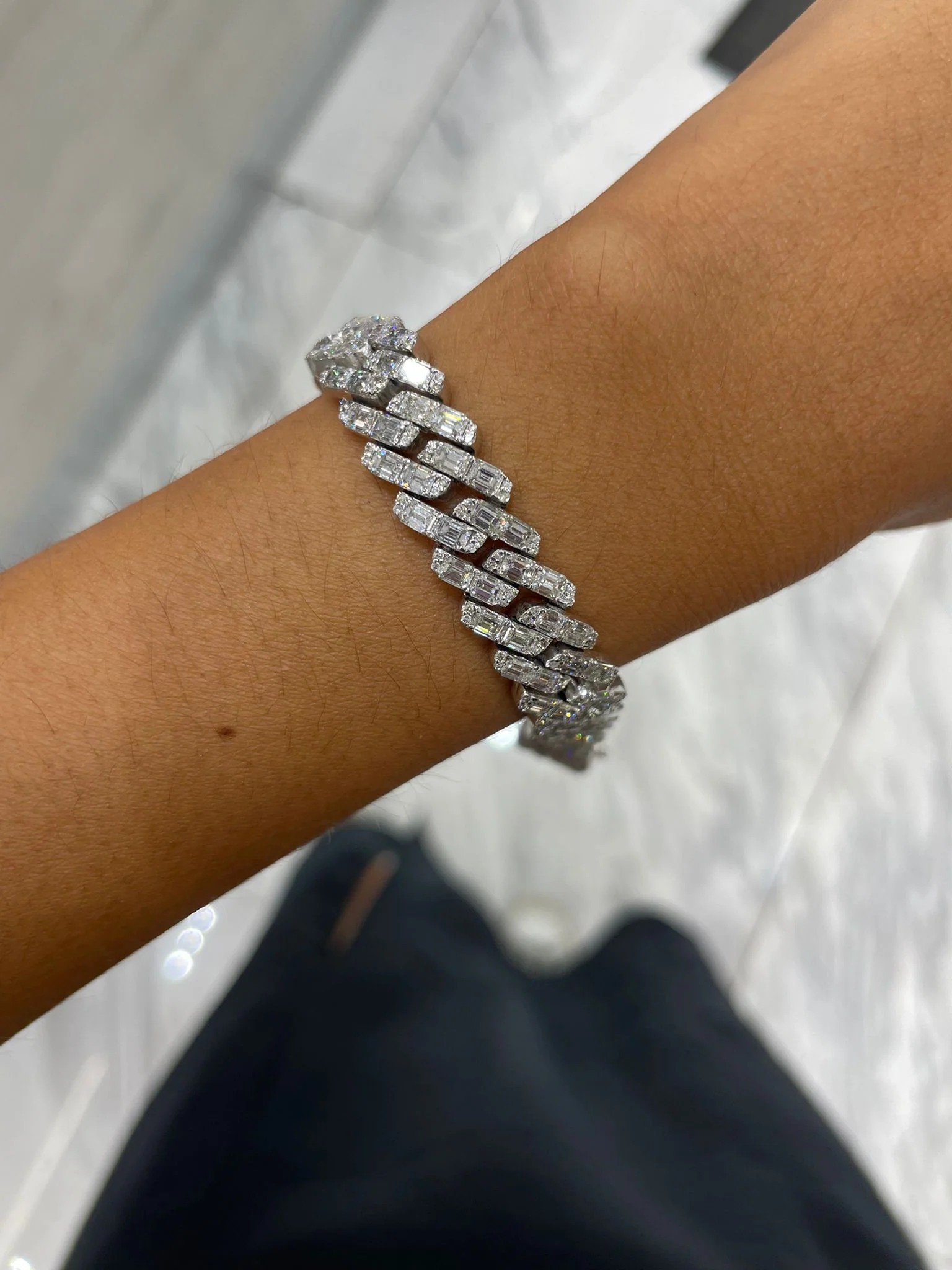 The HAVANA women’s 17 Carat Diamond Cuban Link Chain Bracelet features EMERALD CUT DIAMONDS brilliants weighing a total of approximately 17 carats, set in 14K White Gold.
