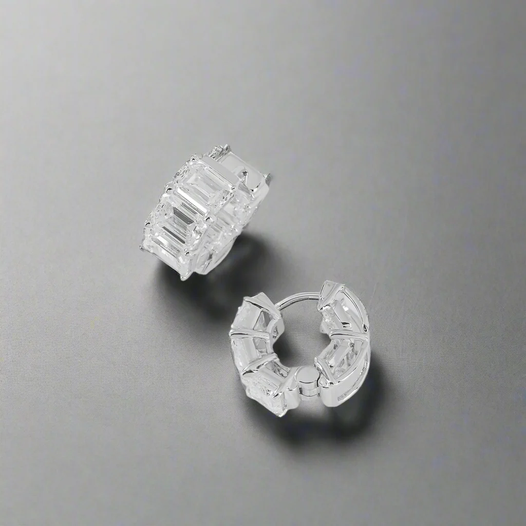 The Lanesha 10 Carats Emerald-Cut Lab-Grown Diamond Mini Hoop Earrings in 14K White Gold redefine elegance and sophistication. Featuring stunning emerald-cut lab-grown diamonds with a total weight of 10 carats, these earrings sparkle with precision and brilliance. Each stone is expertly crafted to maximize its clarity and brilliance, offering a timeless design for any occasion. The hoops, made of high-quality 14K white gold, add a sleek, modern touch that complements the dazzling diamonds. Whether you're elevating your everyday style or making a statement at a special event, the Lanesha earrings are the perfect choice. A luxurious blend of sustainability and beauty, these earrings are designed for the modern woman who values ethical luxury without compromising on style.