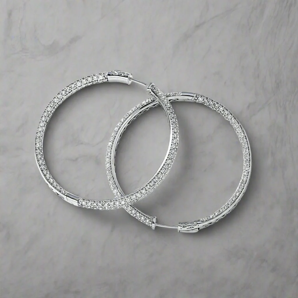 Indulge in elegance with the Leigha Inside-Out Hoop Earrings, a true masterpiece for the modern jewelry connoisseur. These dazzling hoops feature 10 carats of round lab-grown diamonds, carefully arranged in a luxurious triple-row design. Crafted in 14K white gold, these earrings radiate brilliance from every angle with an inside-out diamond setting that ensures sparkle is visible from all sides.